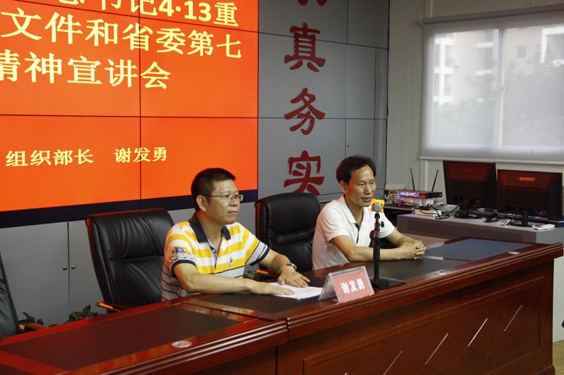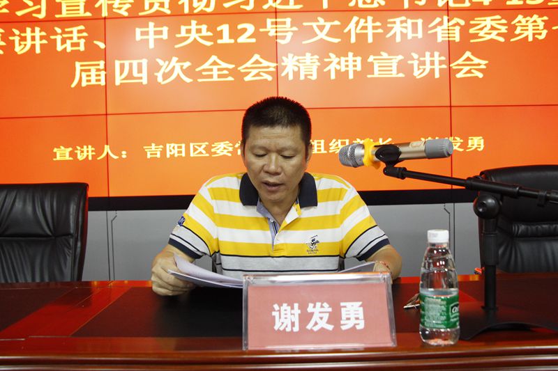 根據(jù)吉陽區(qū)委統(tǒng)一部署,學(xué)習(xí)貫徹習(xí)近平總書記“4·13”重要講話、中央12號文件和省委第七屆四次全會精神宣講會在明佳集團(tuán)三樓會議室舉行。吉陽區(qū)委常委、組織部長謝發(fā)勇作宣講報(bào)告。集團(tuán)黨支部書記、董事長陳明主持宣講會。