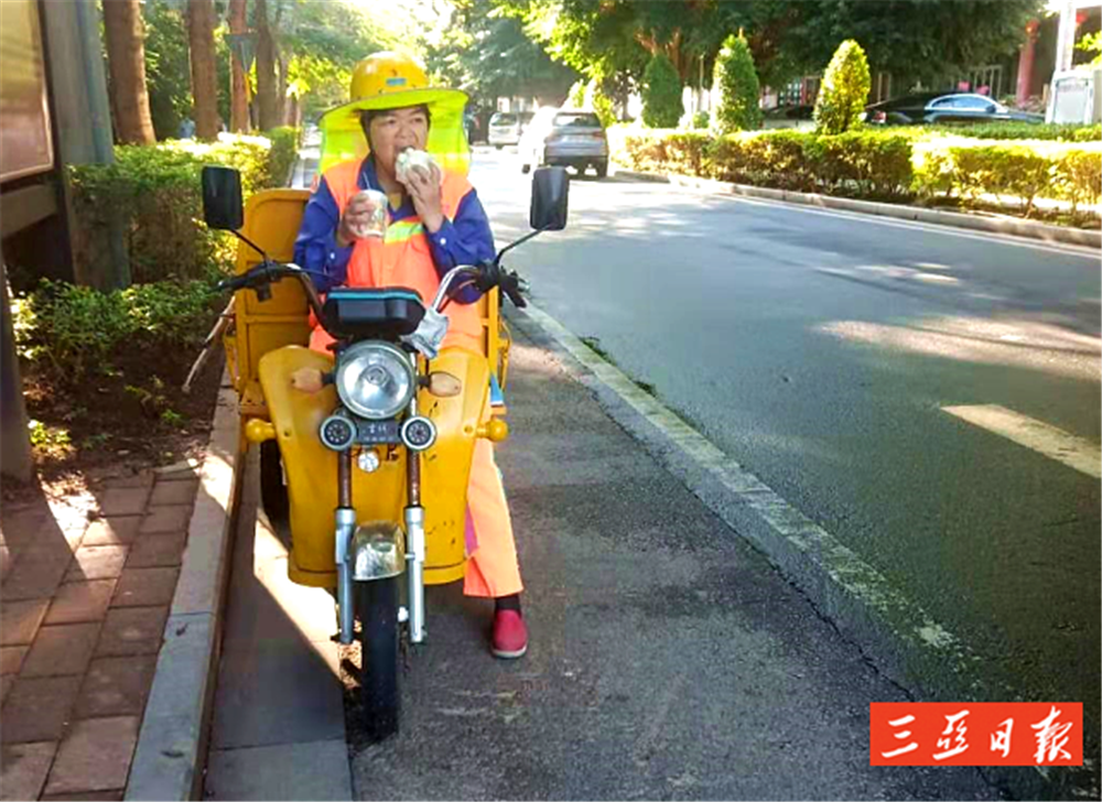 早上常常來(lái)不及在家里吃早餐,藍(lán)亞燕會(huì)帶著微燙的早餐來(lái)上班,等清理一段路后,才會(huì)吃上一口,而此時(shí)早餐往往已經(jīng)涼了。如果累了,要么席地而坐休息幾分鐘,要么在她的“敞篷車(chē)”上休息一會(huì)。