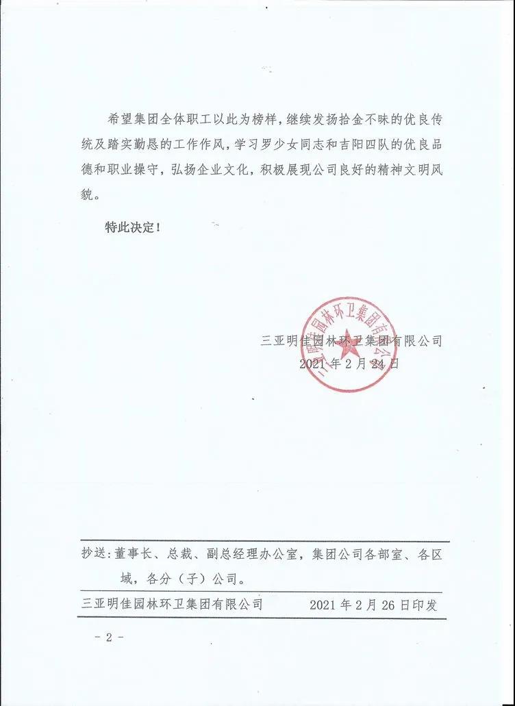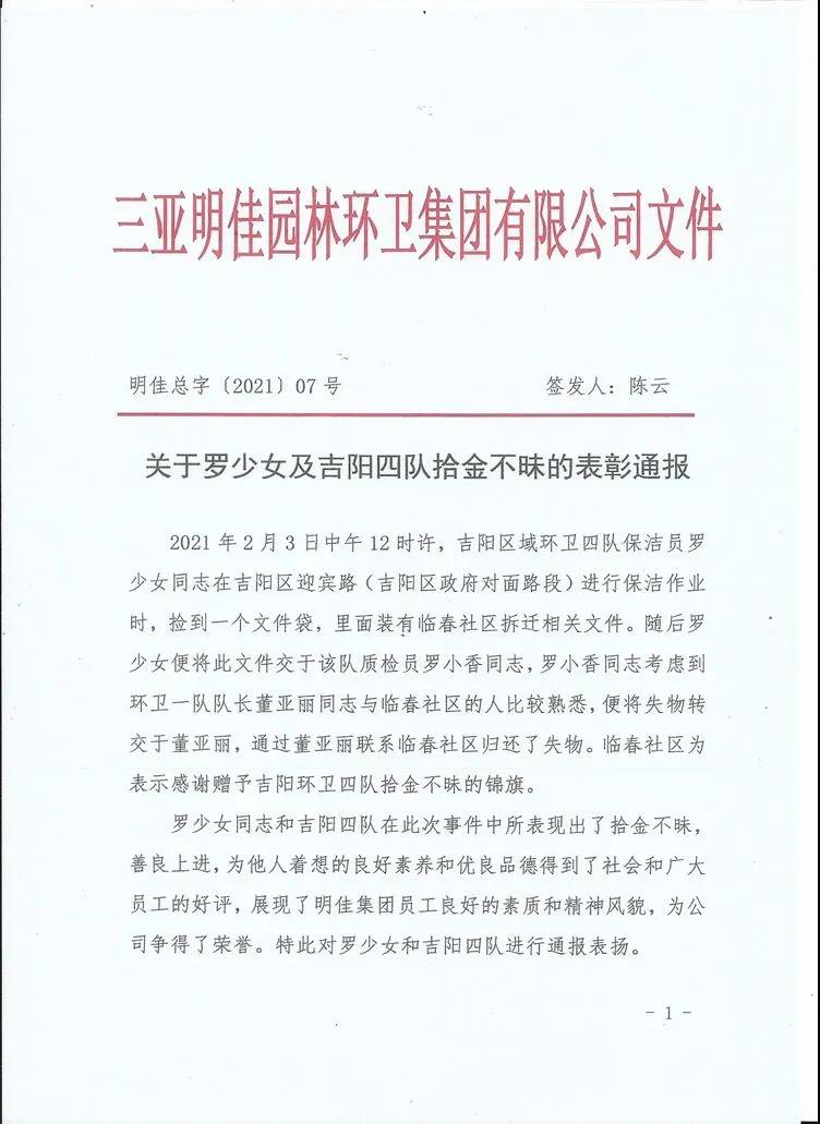 會(huì)上,明佳集團(tuán)黨支部書記、董事長(zhǎng)陳明宣讀了《關(guān)于羅少女及吉陽(yáng)四隊(duì)拾金不昧的表彰通報(bào)》