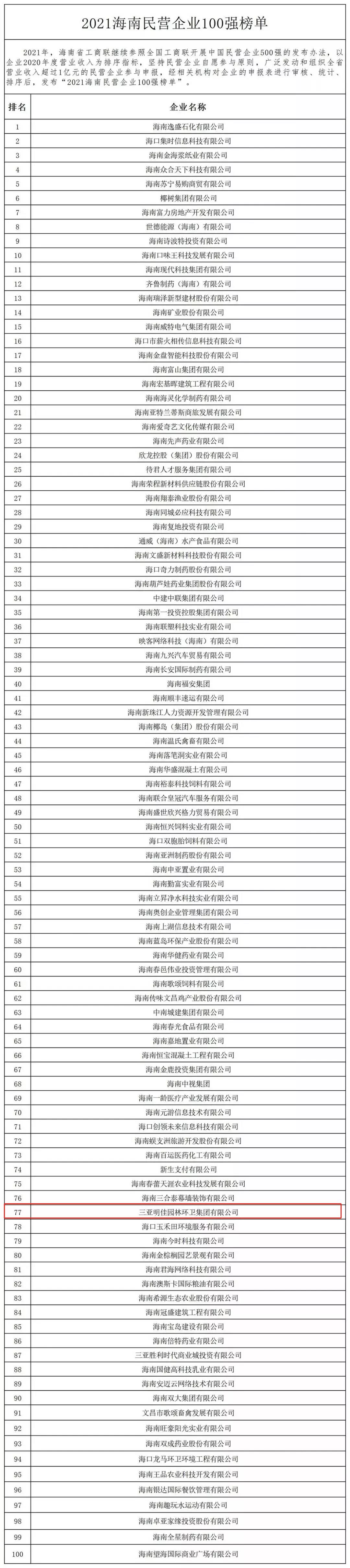 11月4日,海南省工商業(yè)聯(lián)合會(huì)在??诎l(fā)布“2021海南民營(yíng)企業(yè)100強(qiáng)”榜單。三亞明佳園林環(huán)衛(wèi)集團(tuán)有限公司2019至2021年連續(xù)三年入選海南民營(yíng)企業(yè)100強(qiáng)。